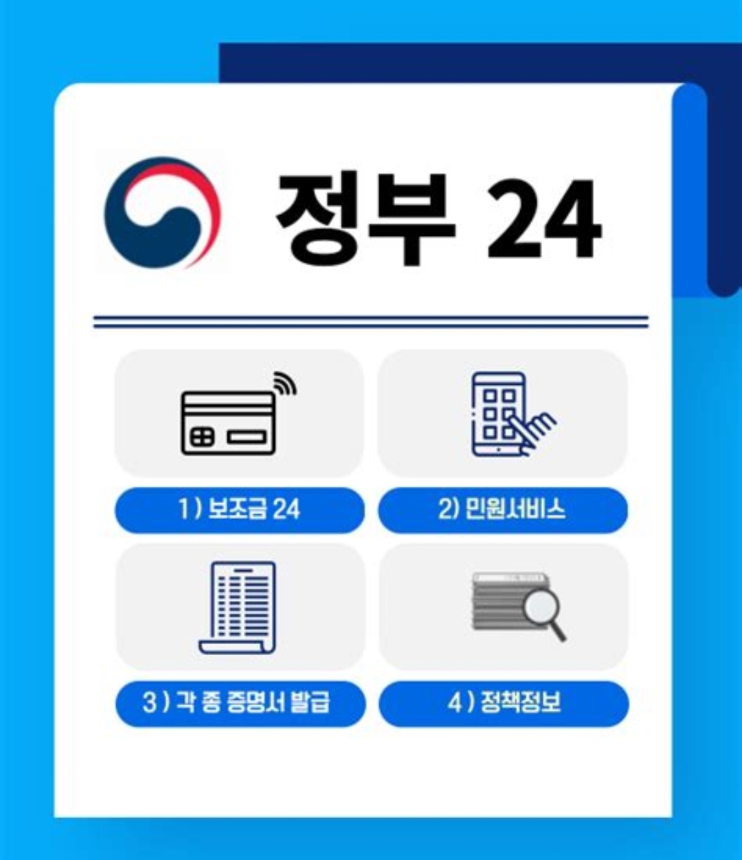 정부24는 국민의 권리를 디지털로 실현하는 대한민국 대표 행정 플랫폼입니다. 증명서 발급부터 보조금 신청, 정책 확인까지 모두 집에서 클릭 한 번으로 해결하세요.