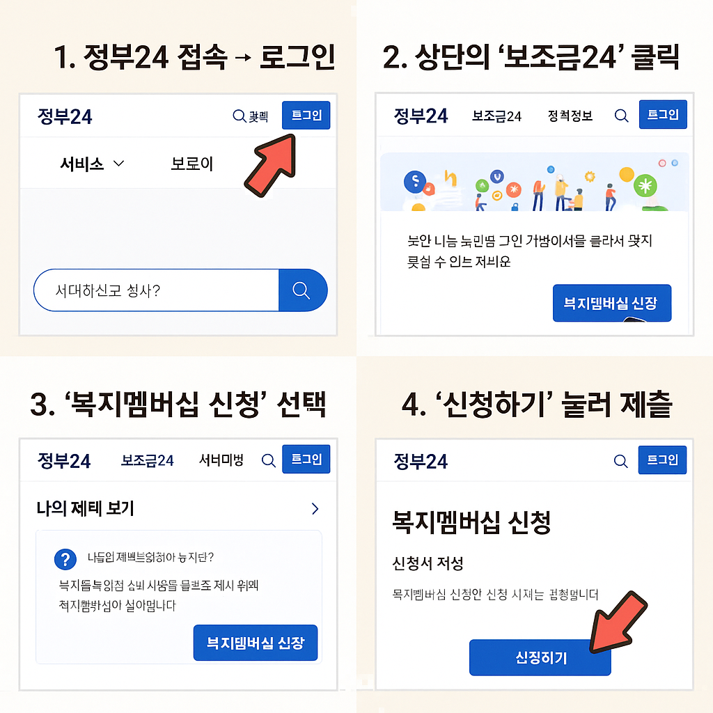보조금24는 수시로 조회 가능하며, 복지멤버십은 문자로 신규 제도나 변경사항이 생기면 자동 안내됩니다.
