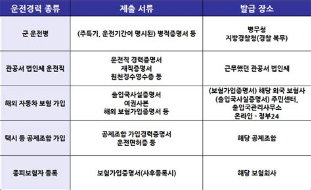 - 본인 조건에 해당하는 자동차 경력인정 증빙 서류 제출