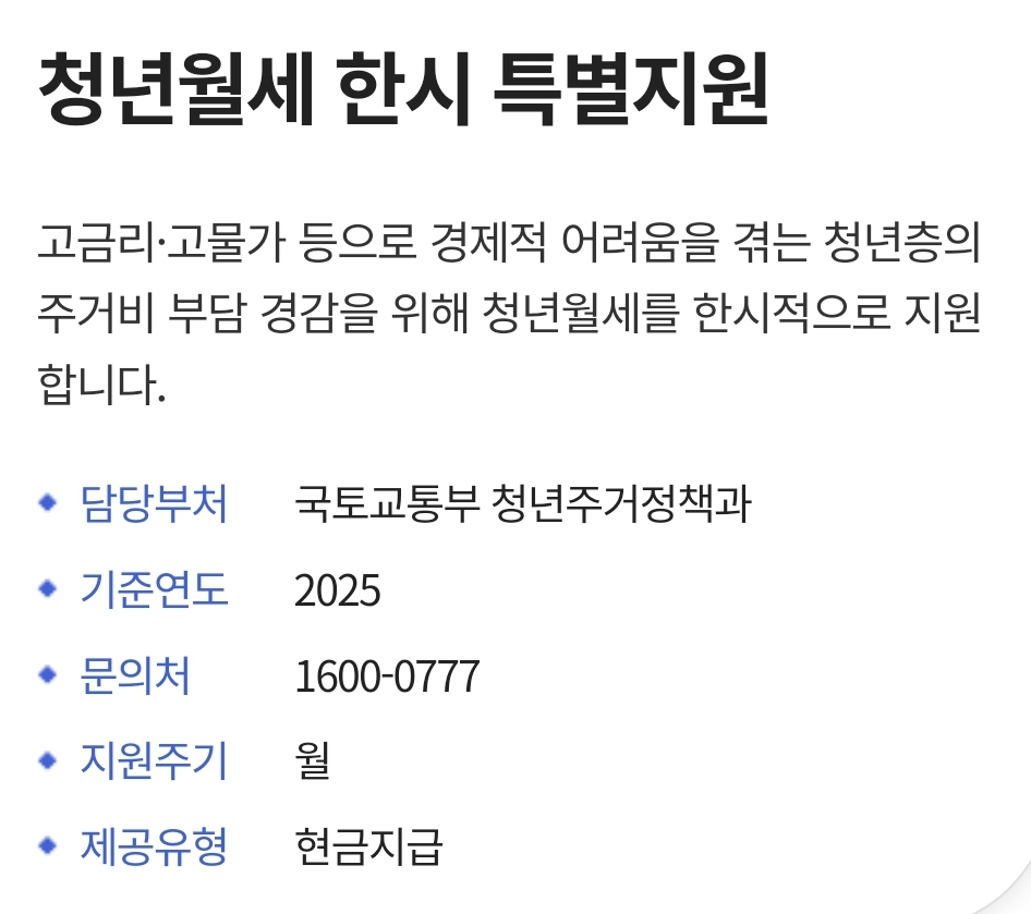 - 지원명: 2025 청년월세 한시 특별지원 사업