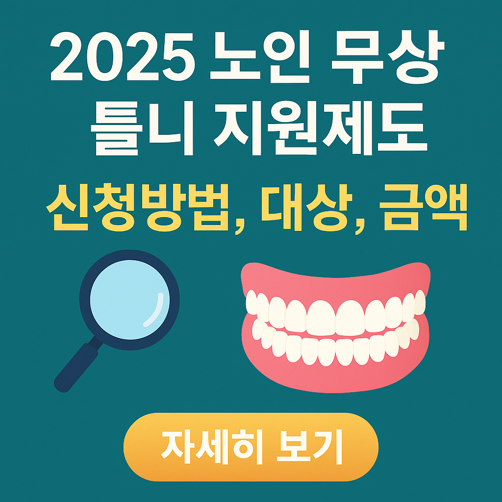 2025년 노인 무상 틀니 지원제도는 고령층의 삶의 질을 높이기 위한 실질적이고 효과적인 복지정책입니다. 만 65세 이상이라면 누구나 혜택을 받을 수 있으며, 건강보험과 보건소, 지자체를 통해 다양한 방식으로 지원됩니다.