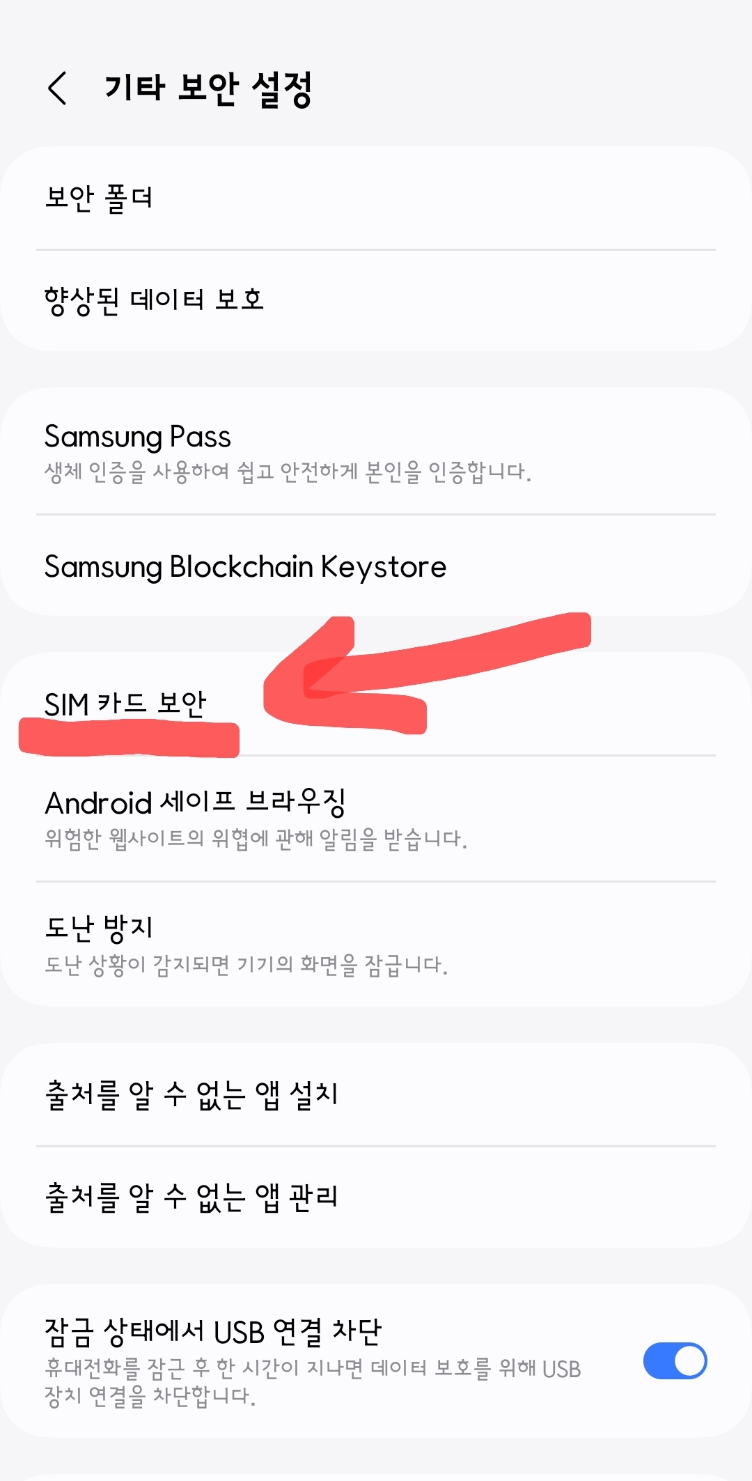- ‘USIM 카드 잠금 설정’ 또는 ‘SIM 잠금’ 선택