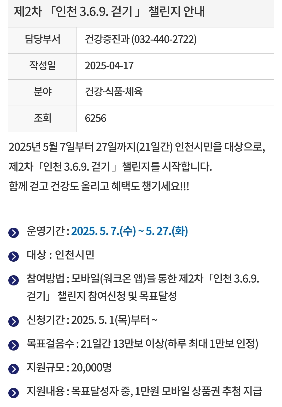 챌린지 관련 자세한 내용은 인천시청 홈페이지 또는 워크온 앱에서 확인하실 수 있습니다.