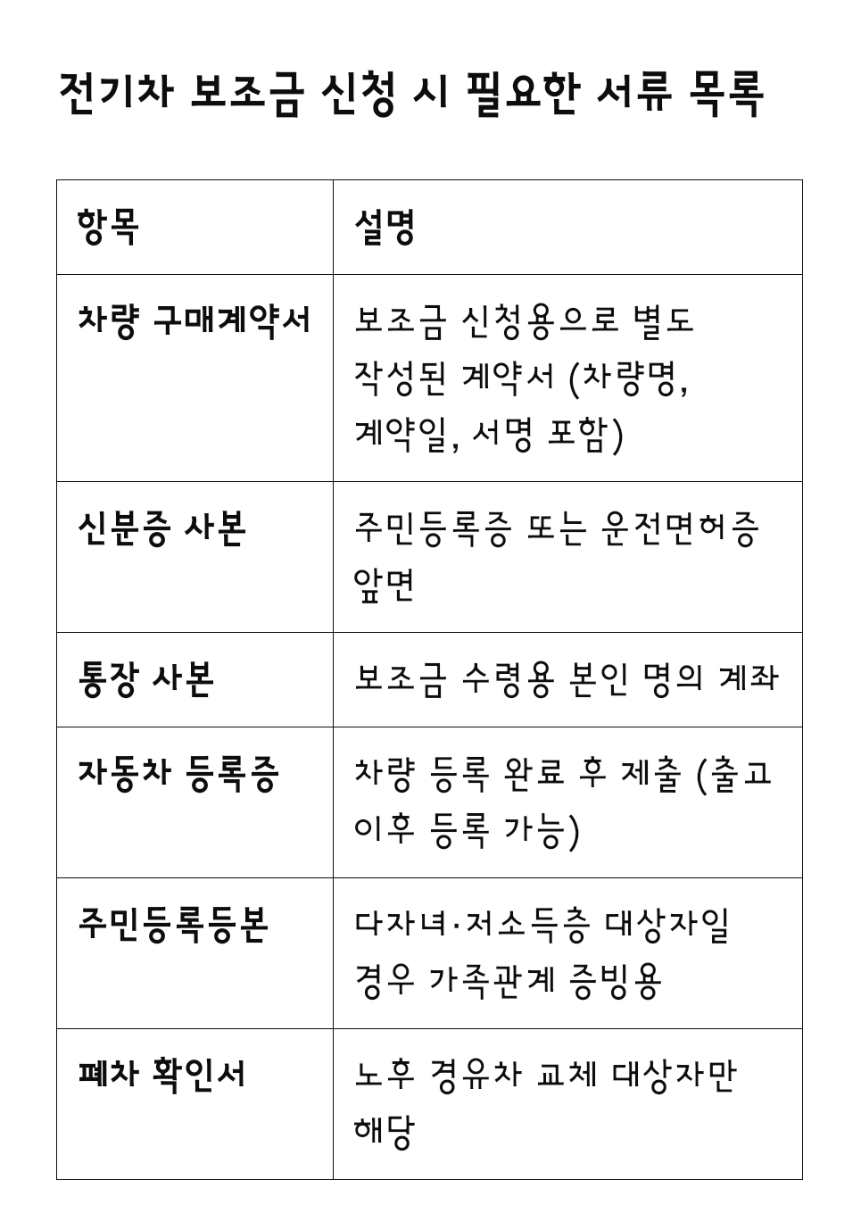 - 전기차 구매 차량에 따라 추가 서류 또는 검수 절차가 있을 수 있으므로 제조사 또는 판매처와 사전 협의하세요.